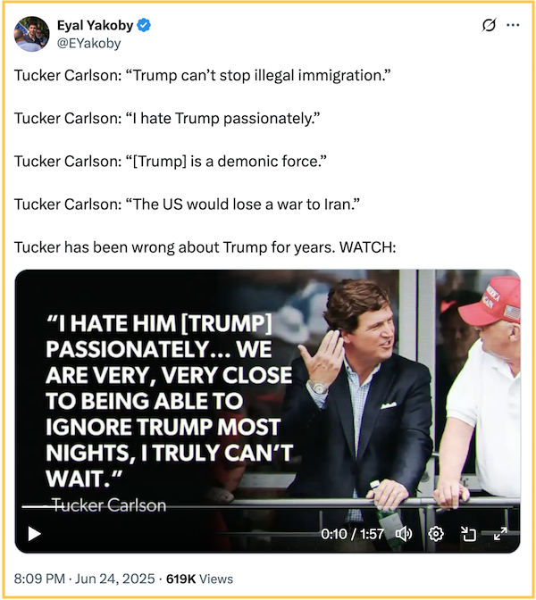 In other words, there is no MAGA schism over Trump’s attack on Iran. To the contrary, there is deep-seated MAGA unity behind Trump and Israel. What we are seeing is not an uproar from Trump’s base, but the whining of a loud but tiny cabal of right-wing isolationists — epitomized by the likes of "kooky" Tucker Carlson, as the president has characterized him, and Rep. Marjorie Taylor Greene (R-GA) — who tried to hijack MAGA to push their own Fortress America agenda. They are completely out of step with Trump and the larger MAGA movement. With Trump’s decision to strike Iran, over their vocal objections, they are quickly finding out, to their shock and surprise, that Trump is not an isolationist — and neither are his supporters.