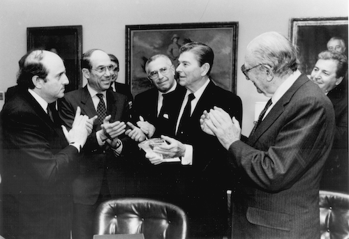 RJC founders (l-r) George Klein, Richard Fox, Gordon Zacks, and Max Fisher presented President Ronald Reagan with a gift in 1987.