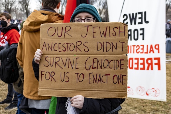 Jewish Voice for Peace (JVP) protester at the People's March, Washington, DC, January 18, 2025. Photo credit: Diane Krauthamer, CC BY-NC-SA 2.0