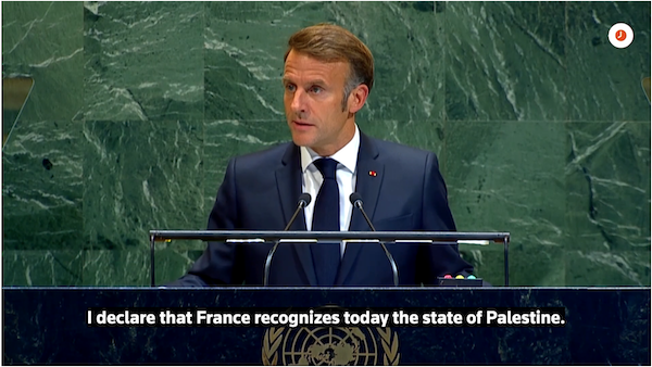 On Monday, a meeting was held at the United Nations with the typically officious title of "High-level International Conference for the Peaceful Settlement of the Question of Palestine and the Implementation of the Two-State Solution." At that meeting, French President Emmanuel Macron announced that France recognizes the imaginary "state of Palestine." Andorra, Belgium, Luxembourg, Malta, and Monaco also announced or confirmed their recognition of a Palestinian state at the meeting.