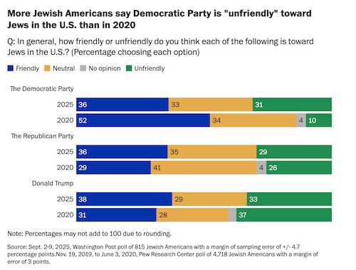 About 3 in 10 American Jews say the Democratic Party is unfriendly toward Jews (31 percent), roughly triple the proportion in a 2020 Pew survey and on par with 29 percent who say the Republican Party is unfriendly.