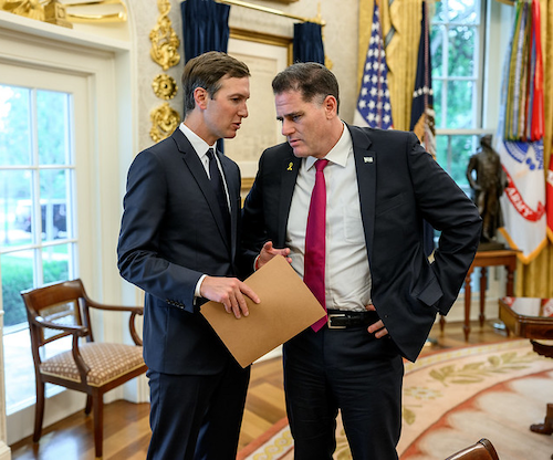 Jared Kushner speaks with Israeli Minister of Strategic Affairs Ron Dermer as President Donald Trump hosts a bilateral meeting with Prime Minister Benjamin Netanyahu of Israel to discuss the US peace plan for Gaza, Monday, September 29, 2025, in the Oval Office. (Official White House Photo by Daniel Torok)