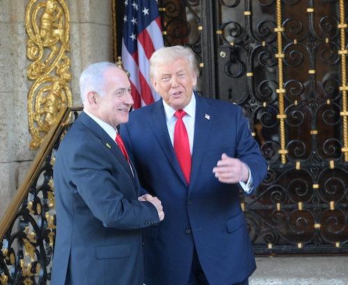 President Donald Trump greets Israeli Prime Minister Benjamin Netanyahu at Mar-a-Lago on December 29, 2025. Photo credit: Amos Ben-Gershom (GPO)