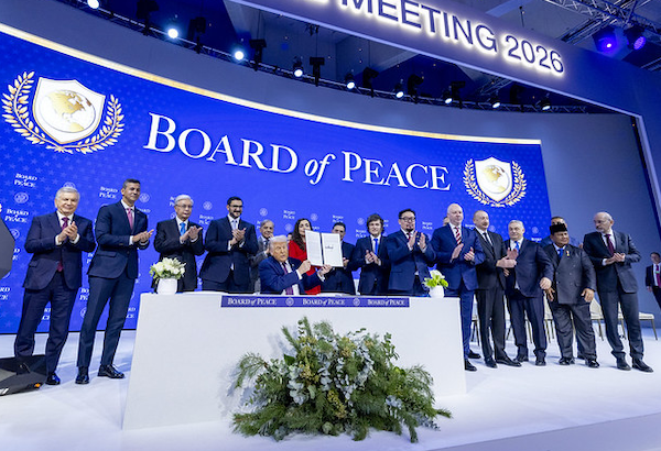 President Donald Trump and world leaders launch the Board of Peace in Davos, Switzerland, January 22, 2026. Source: World Economic Forum / Benedikt von Loebell / Creative Commons
