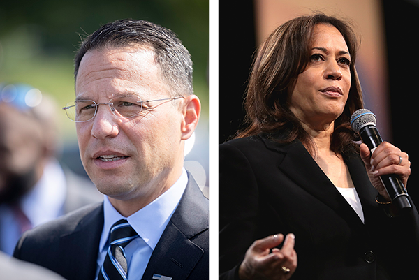 PA Gov. Josh Shapiro (Source: Gov. Tom Wolf, Flickr), Kamala Harris (Source: Gage Skidmore, Wikipedia Commons)