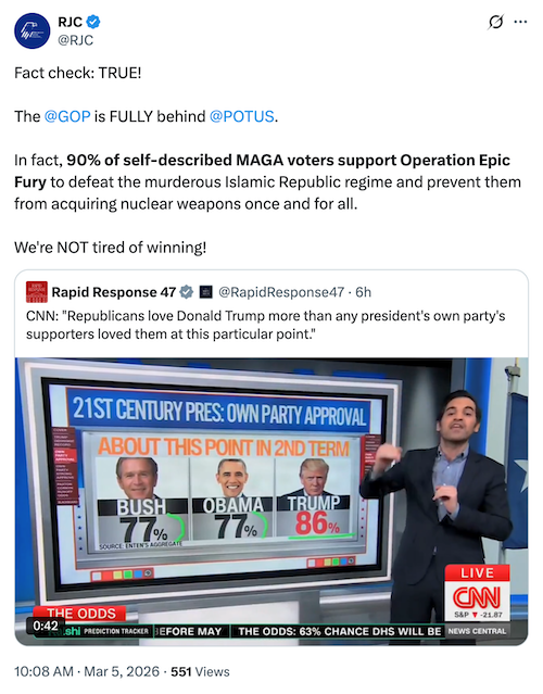For America's most overrated and diabolical podcaster, Tucker Carlson, and his cabal of like-minded miscreants, [the success of Operation Epic Fury] is devastating. The United States is winning, as is its closest ally, Israel, in what is one of the most remarkable and successful alliances in history. We will be safe from the Iranian regime's nuclear threats and terrorism, and tens of millions of Persians will be free again.